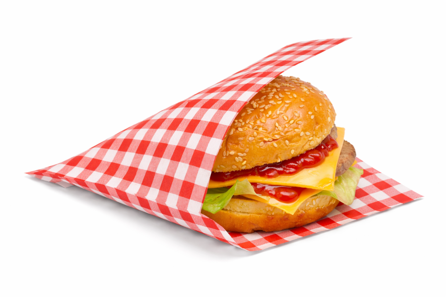 Classic red gingham open-sided takeaway bags designed for serving burgers, pretzels and greasy fast food with ease. Food safe, grease resistant and ideal for busy takeaway and street food service.