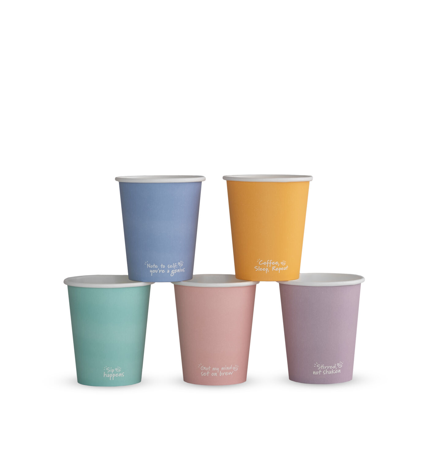 Sustainably-sourced board with a plant-based PLA lining. Available in a mixed sleeve of five cheerful colours.